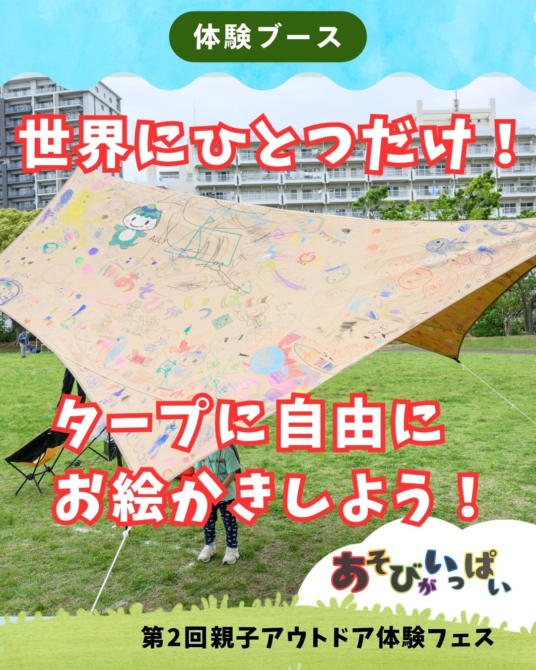 大きなタープに思いのままにお絵かき!自分だけのオリジナルデザインを描いて、アウトドアをさらに楽しくしましょう。想像力を広げて、自由に絵を描いてみてください! ふじキュン♡と一緒に楽しみながら描いてみましょう!
