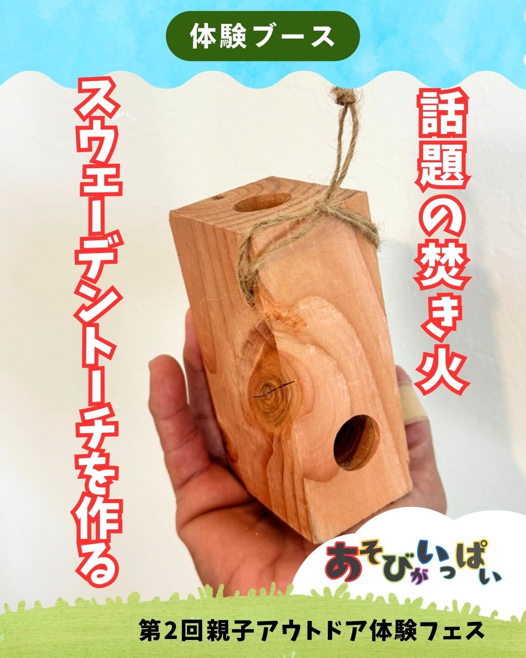 スウェーデン発祥の焚き火用スウェーデントーチを制作します。スウェーデントーチとは、切れ込みや空気孔を施した丸太のことです。今回は、手軽に材木を使って作成します。親子で木工を楽しむ機会を提供し、自分で考え、形にする楽しさを体験しましょう。