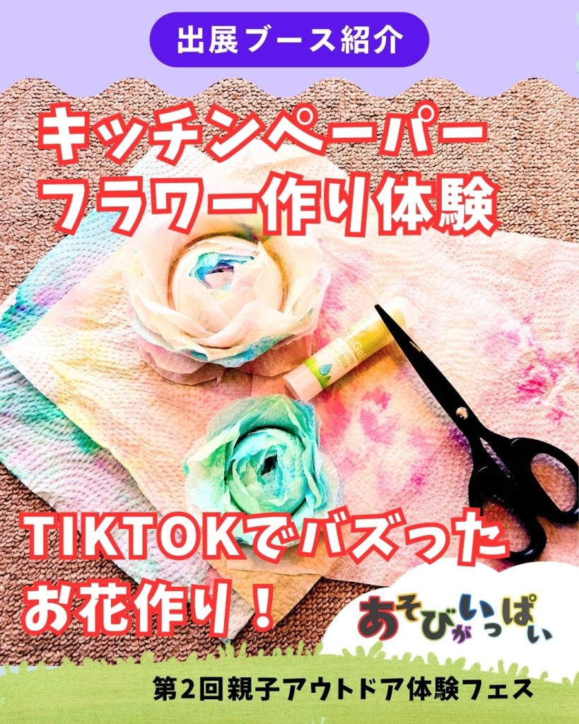 あのTikTokで話題になった「キッチンペーパーで簡単フラワー作り」では、キッチンペーパーを使用して、本物のような“花”を作る体験ができます。子供から大人まで、誰でも美しく素敵な花の飾りを楽しめます。また、手作りアクセサリーの販売も行っています!