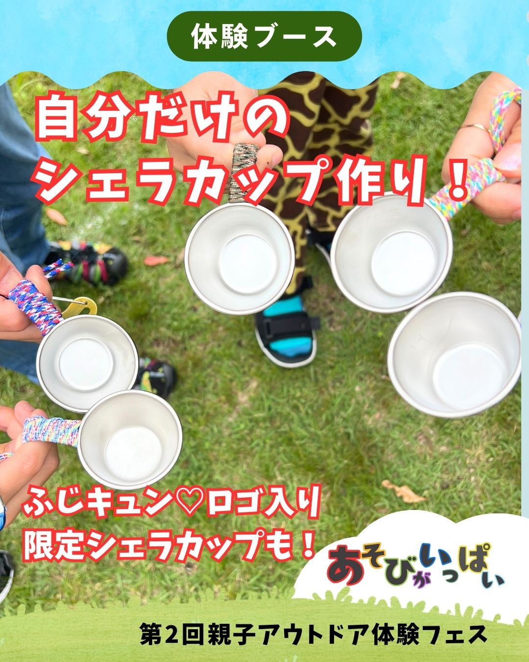 アウトドアでも活躍するパラコードを使って、世界にひとつの“マイシェラカップ”を作ってみよう!当イベント限定『ふじキュン♡』入りシェラカカップをご用意(先着30名限定)します!