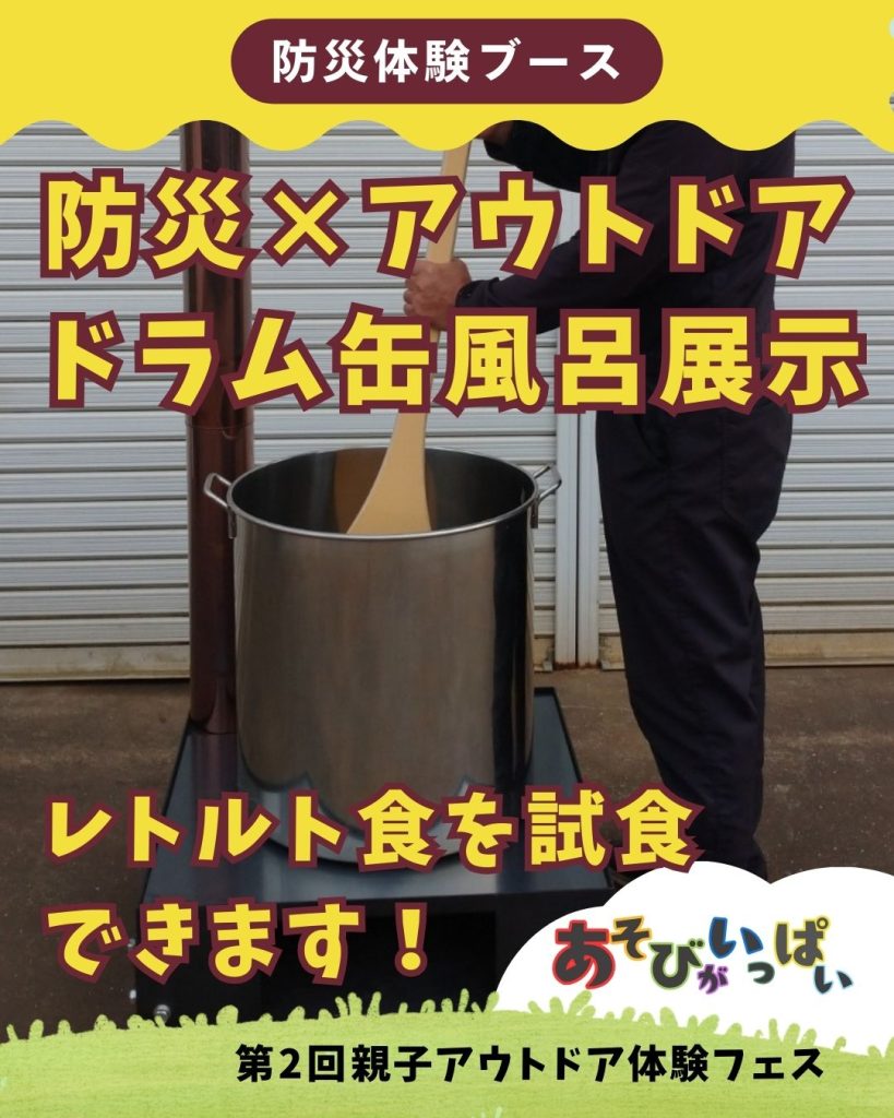 本格的なドラム缶風呂用釜の展示と、寸胴鍋で実際に火を起こし、温めたレトルト食品を試食できる体験は、防災やアウトドアに役立つ貴重な知識が詰まっています!なかなか見ることのできないドラム缶風呂は必見です!