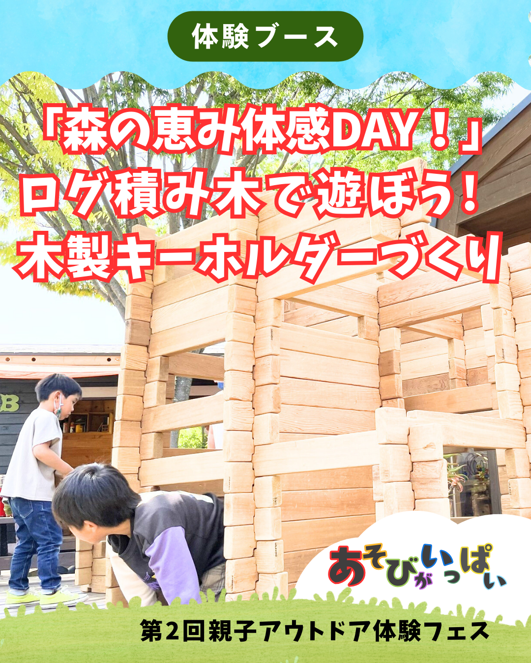 ログハウスのBESSが贈る『森のめぐみ体感DAY!!』ログハウスや木の家の建築端材を使ってオリジナルキーホルダーを制作したり、子どもの身体より大きなログ積み木で遊んで、木や森の魅力を体いっぱい感じよう! LOGWAYご来場でBESSオリジナルノベルティのプレゼントも!