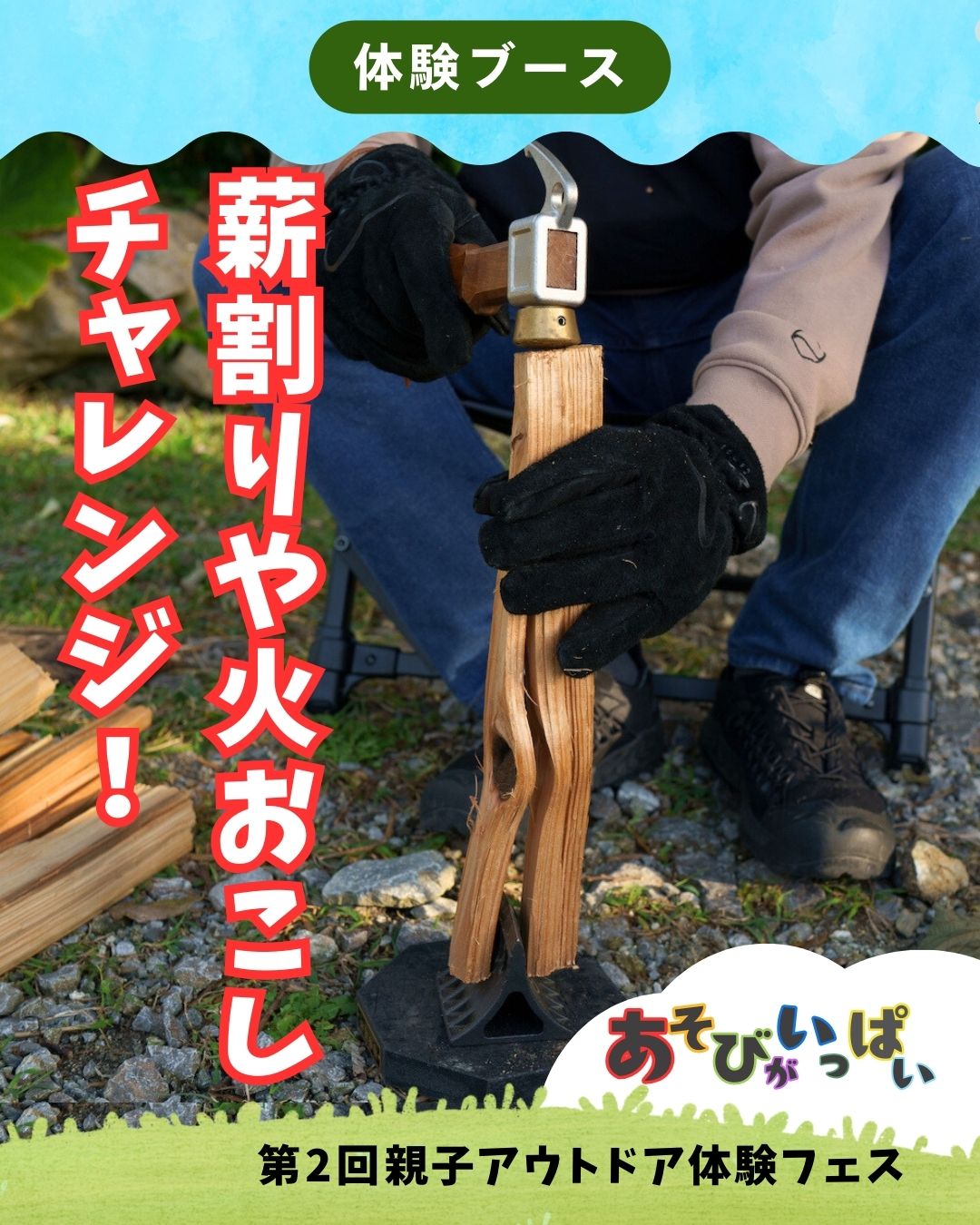 オリジナルキャンプ用品を制作しているZEN Campsです。子どもでも手軽に薪割りができる新商品「クサビ」を使った薪割り体験や、ファイヤースターターを使って火花を散らしながら火を起こす体験会を開催します。
