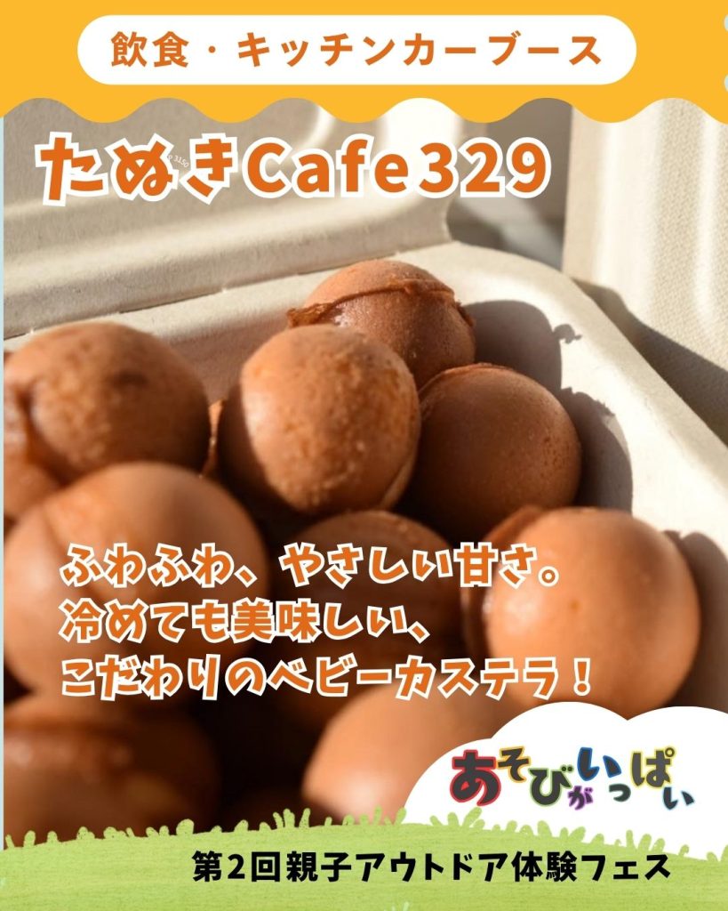冷めても美味しい“たぬきCafe329のベビーカステラ”。ふわふわ食感とやさしい甘さがクセになる逸品。使っている卵は、農業祭でも最高位の優等を受賞した「鳳凰卵」はちみつ不使用で、小さなお子さまでも安心。カステラの他にもチュロスやドリンクも!