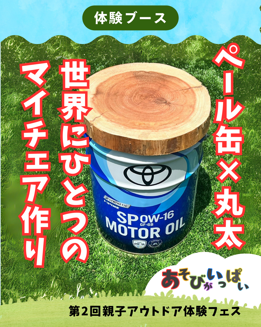 茅ヶ崎のS-Factory Shonanでは、キャンプや家庭で使える自然派クラフト体験を提供しています。直径30 cmの丸太を輪切りにした木とペール缶を使い、オリジナルの椅子を作るワークショップでは、木の個性を楽しみながら、自然の木を知ってもらえます。